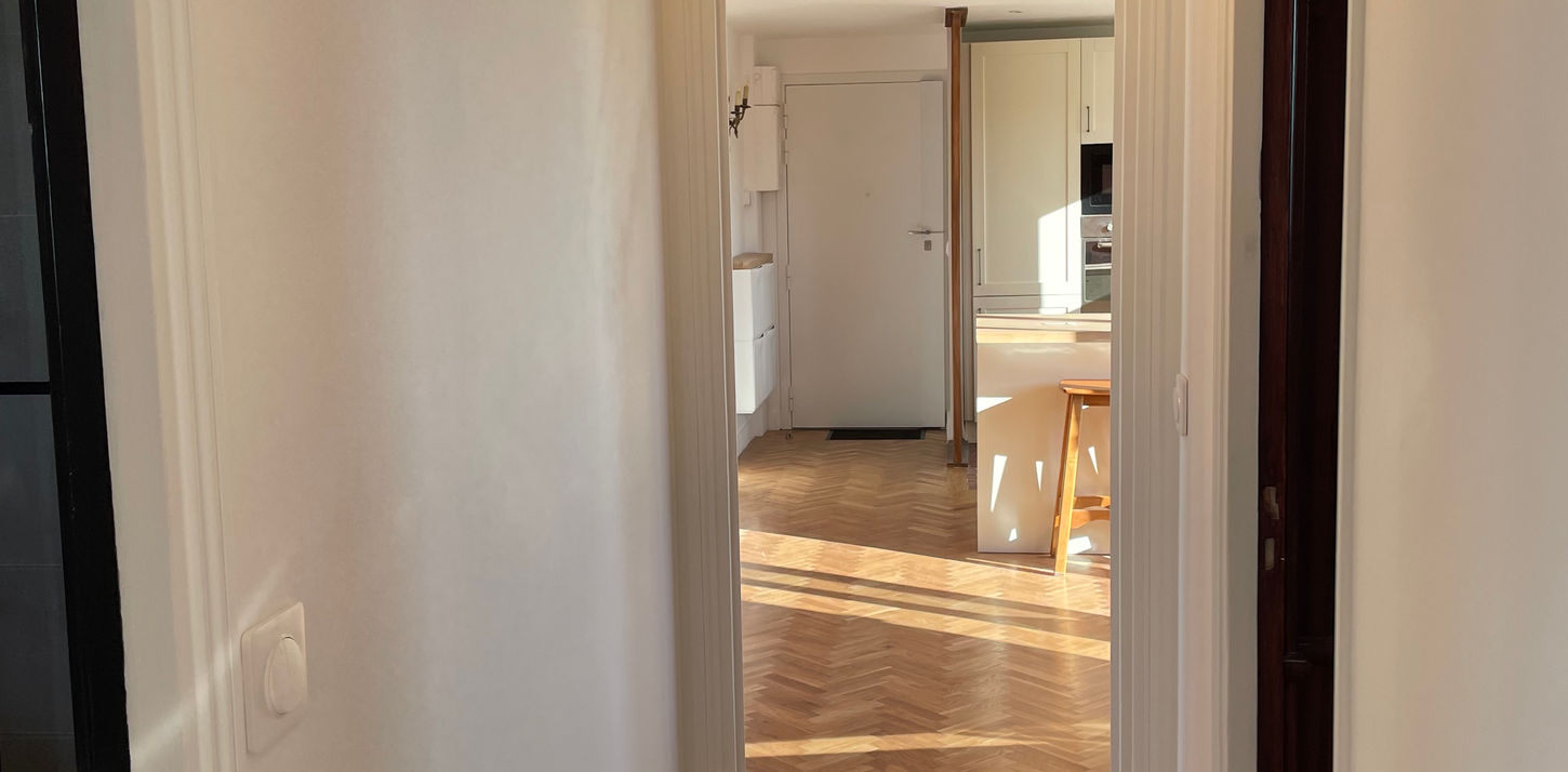 Rénovation complète d’un appartement de 80 m² : transformation totale avec création de nouveaux espaces. Un style à la fois luxueux et cosy, sublimé par des matériaux nobles comme le parquet en chêne massif.