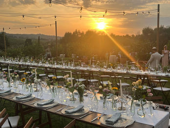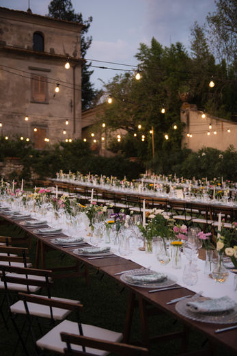 La scénographie du mariage à Florence évoque un univers à la fois champêtre et romantique, où le charme rustique de la Toscane rencontre une esthétique poétique. Des éléments en bois brut, des guirlandes de lumière suspendues et des touches de verdure créent une ambiance chaleureuse et authentique. Des tables en bois naturel, parées de nappes délicates et de bouquets floraux sauvages, apportent une note douce et élégante. L'ensemble crée une atmosphère intime et romantique, sublimée par la beauté intemporelle de Florence.